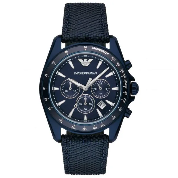 Dit dynamische blauwe IP-heren Emporio Armani-horloge heeft een aluminium tachymeter-topring en een blauwe sunray chronograaf wijzerplaat geaccentueerd met zilverkleurige indexen, een datumvenster en drie subwijzerplaten. Een met leer beklede blauwe Cordura tactische nylon band maakt de look compleet. Op de horloges zijn twee stuks stijlvol aangebrachte indexen, wijzerplaat met zilveren wijzers die uw ogen troosten die perfect past bij de mannelijke elegantie van een elegant gevoel dat bijdraagt aan nonchalante scherpe details, ook voor hun band en de combinatie van minimalistisch design. 42 mm breed