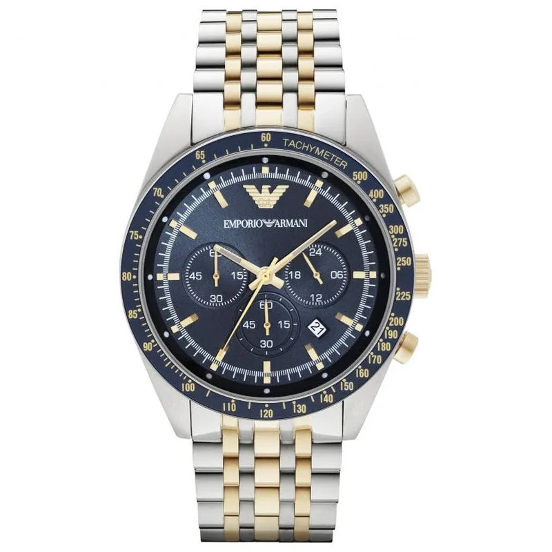 Japans quartz chronograaf uurwerk. 46 x 13 mm roestvrijstalen kast. Stevige achterkant. Blauwe tachymeterring. Goud PVD vergulde stalen duwers en kroon. Blauwe wijzerplaat. Lichtgevende gouden PVD-vergulde roestvrijstalen wijzers en indexen. Datum tussen 4 en 5 uur. 24 mm x 20 cm tweekleurige gouden PVD-vergulde stalen en roestvrijstalen armband met roestvrijstalen vlindersluiting.