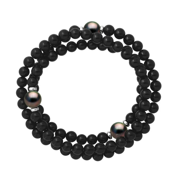 Armband Drie Rijen - ONYX ZWART VERBLUFFEND - 3 Echte Tahitiaanse Gecultiveerde Parel Rond van 8-9 mm - Sterling Zilver 925 Duizendsten Steunen | HR® elastisch - Hoge Weerstand | Gemaakt in onze Franse Werkplaats | Geleverd met onze prestigebox en een certificaat van garantie & authenticiteit