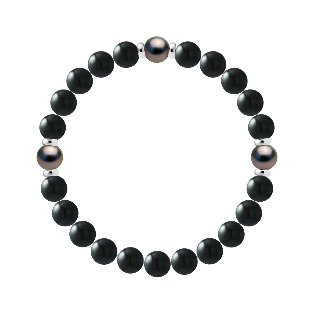 Armband - 3 Echte Tahitiaanse Cultuurparels Rond van 8-9 mm - ONYX ZWART VERBLUFFEND - Sterling Zilver 925 Duizendsten Fittingen | HR® elastisch - Hoge Weerstand | Gefabriceerd in onze Franse Werkplaats | Geleverd met onze prestige doos en een certificaat van garantie & authenticiteit