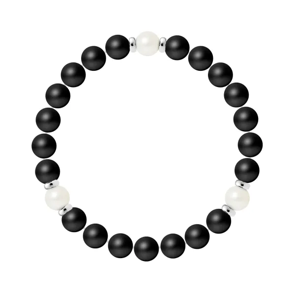 Armband 3 Stenen - NATUURLIJKE MAT ZWARTE AGAAIT | CULTIVEERD ZOETWATERPAREL WIT | Sterling Zilver 925 Duizendsten Ferrules | HR® elastisch - Hoge Weerstand | Gefabriceerd in onze Franse Werkplaats | Geleverd met onze prestigieuze doos en een garantie- en echtheidcertificaat