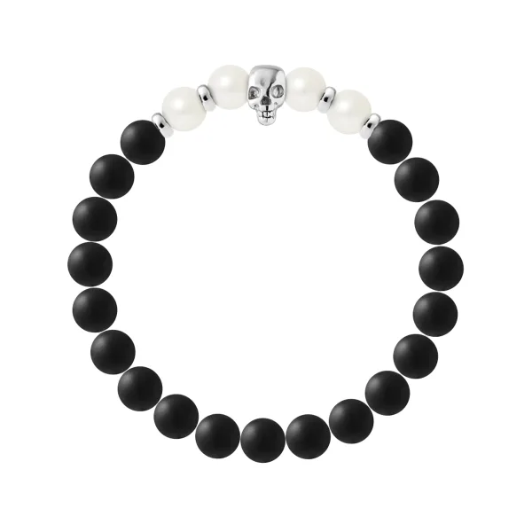 Armband TETE DE MORT - ZWART AGAATSTEEN - WITTE FRESHWATERPAREL - Skull Head Sterling Zilver 925 Duizendsten | HR® elastisch - Hoge Weerstand | Geproduceerd in onze Franse Werkplaats | Geleverd met onze prestige doos en een certificaat van garantie & authenticiteit