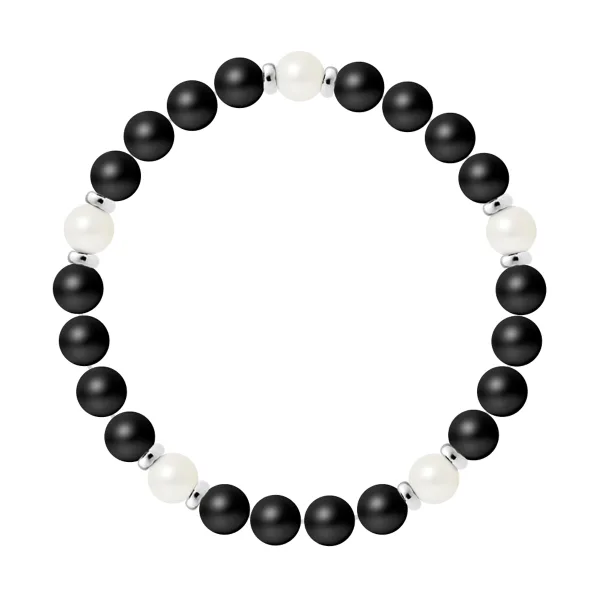 Armband 5 stenen | ZWART AGAATSTEEN - GECULTIVEERDE ZOETWATERPAREL WIT | Sterling Zilver 925 Duizendsten Fittingen | HR® elastisch - Hoge Weerstand | Gefabriceerd in onze Franse Werkplaats | Geleverd met onze prestigieuze doos en een garantie- en authenticiteitscertificaat