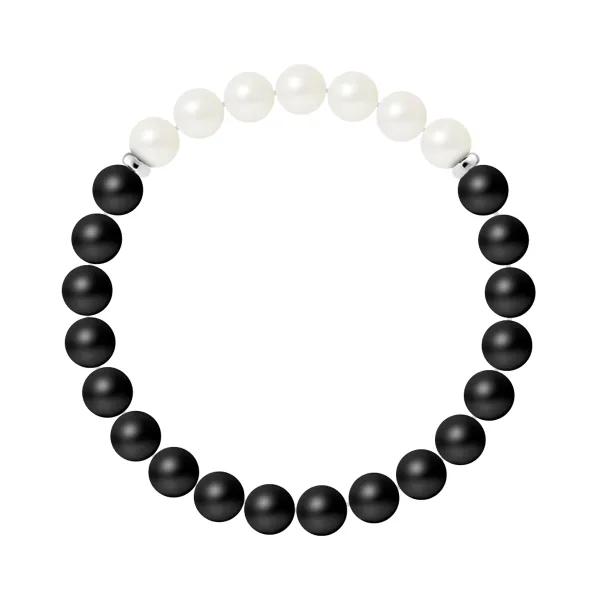 Armband 7 Stenen | ZWART AGATEN STEEN - GEKWEKE FRISWATER WITTE PAREL | Sterlingsilver 925 Duizendsten Kappen | HR® elastisch - Hoge Weerstand | Gefabriceerd in onze Franse Werkplaats | Geleverd met onze prestige box en een certificaat van garantie & authenticiteit