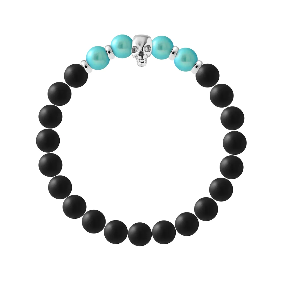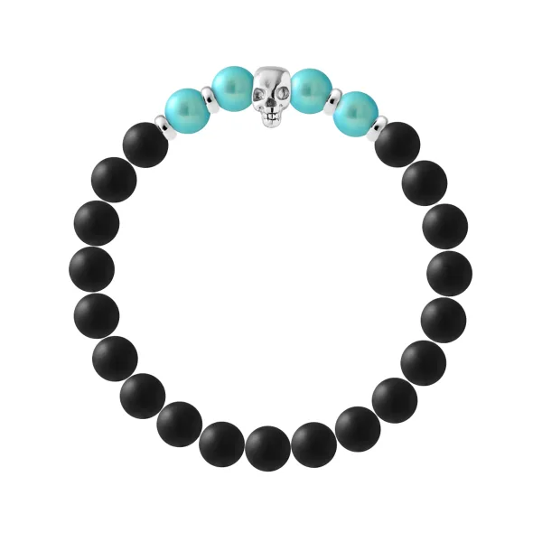 Armband TETE DE MORT - AGATA BLACK - TURQUOISE FRESHWATER PEARL - Skull Head Sterling Silver 925/1000 | HR® elastisch - Hoge Weerstand | Geproduceerd in onze Franse Werkplaats | Wordt geleverd met onze prestige doos en een certificaat van garantie & authenticiteit