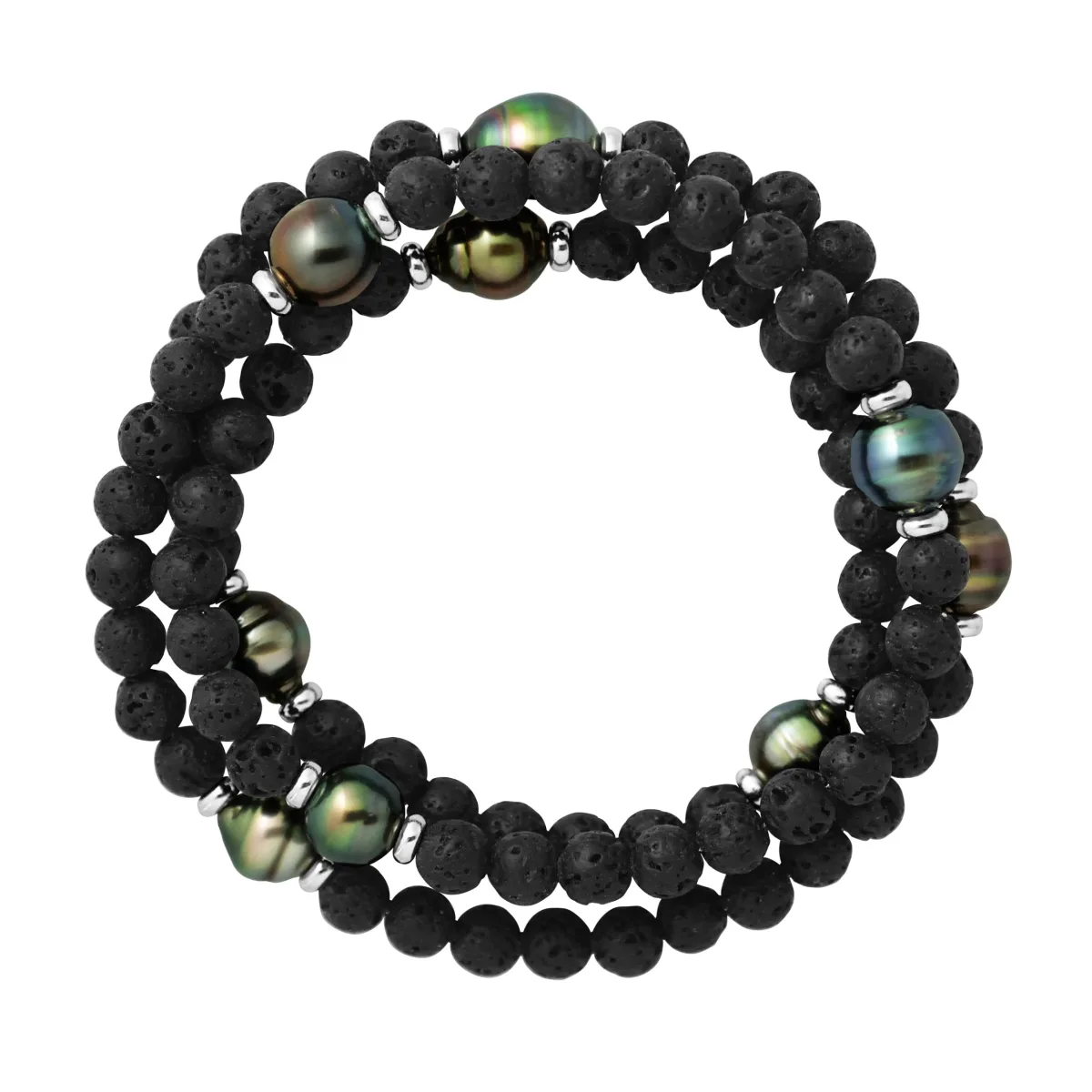 Armband Drie Rijen - Natuurlijke Lava Steen - 9 Echte Tahitiaanse Cultiveerbare Parel Cirkelvormig 8-9 mm - Sterling Zilver 925 Duizenddelen Ferrules | HR® elastisch - Hoge Weerstand | Gemaakt in onze Franse Werkplaats | Geleverd met onze prestigieuze doos en een certificaat van garantie & authenticiteit