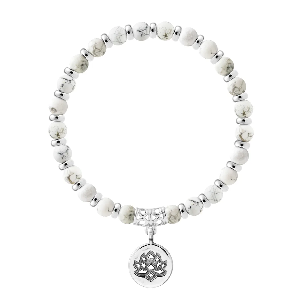 Armband Pure Gem | Natuurlijke witte Howlite steen - Ferrules 'MAGIC LOTUS' Sterling Zilver 925 Duizendsten | HR® elastisch - Hoge Weerstand | Geproduceerd in onze Franse Werkplaats | Geleverd met onze prestige doos en een garantie- en authenticiteitscertificaat