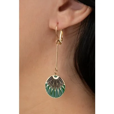 Geef je outfit een roaring twenties touch met deze Art Deco Disc oorbellen in smaragdgroen. Een lange oorbel in antiek goudkleurig metaal met een rond handbeschilderd geëmailleerd hangertje in smaragdgroen voorzien van bladvormige details en een vleugje art-deco... wow! * Antiek goudkleurig metaal * Leverback sluiting * Handbeschilderd emaille * Nikkelvrij