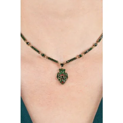 Complimenteer je outfit met deze prachtige ketting om je hals! Geïnspireerd op de elegante vormen van de jaren 20 en uitgevoerd in antiek goudkleurig messing, bezet met fonkelende glas kristalletjes/strass steentjes in smaragdgroen. * Antiek goudkleurige messing * Verstelbaar * Karabijnsluiting * Strass/glaskristal * Nikkelvrij/hypoallergeen * Maak je look compleet en combineer haar met de bijpassende oorbellen