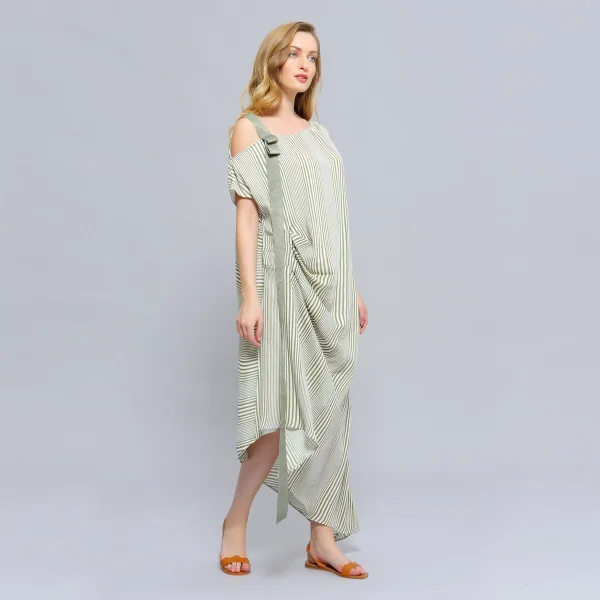 - Bij secretsales.nl kun je Asymmetrische gedrapeerde streepprint midi -jurk kopen voor slechts €92,50