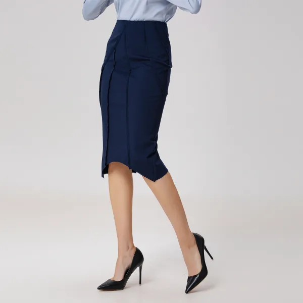 Een asymmetrisch kledingstuk met een originele structuur: een reeks omgekeerde naden die dwars langs de benen en heupen lopen en het silhouet energiek maken. Deze rok heeft een gebogen zoom die aan de zijkanten uitsteekt. Gemaakt van comfortabel stretchmateriaal. Een gewaagd stuk voor semi-formele gelegenheden zoals cocktailparty's of diners. Draag met blouses, jassen, overhemden, truien. Productdetails: Vorm: getailleerd/aangepast Lengte: 64 cm Onzichtbare ritssluiting middenachter