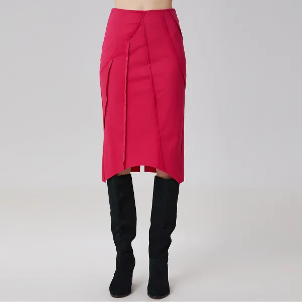 Een asymmetrisch kledingstuk met een originele structuur: een reeks omgekeerde naden die dwars langs de benen en heupen lopen en het silhouet energiek maken. Deze rok heeft een gebogen zoom die aan de zijkanten uitsteekt. Gemaakt van comfortabel stretchmateriaal. Een gewaagd stuk voor semi-formele gelegenheden zoals cocktailparty's of diners. Draag met blouses, jassen, overhemden, truien. Productdetails: Vorm: getailleerd/aangepast Lengte: 64 cm Onzichtbare ritssluiting middenachter