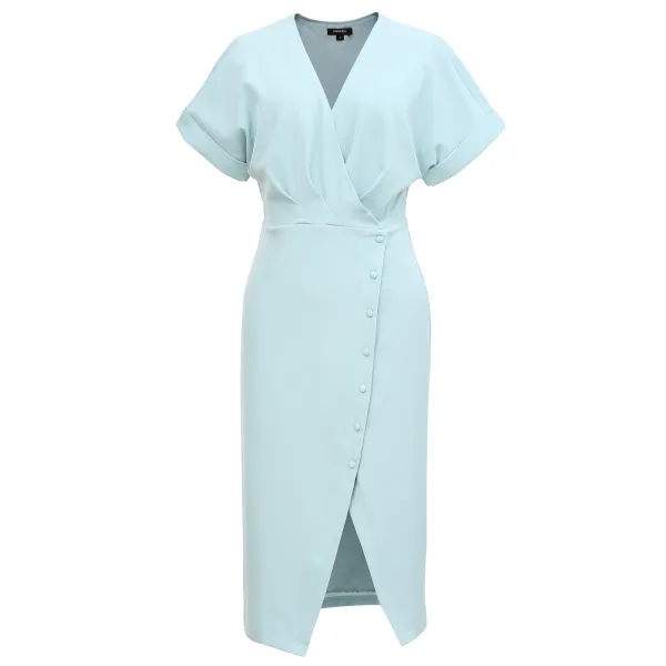 Een gestructureerd stuk met een Empire Cut die de splitsing onderstreept met een kruis-hart-effect op de voorkant. Gemonteerde maat en gesneden lijn, open aan de linkerkant en versierd met een rij decoratieve knoppen. Een diagonale spleet onthult het been. Zoveel verfijnde details die deze jurk een elegant stuk maken. Geschikt voor semi-formele gelegenheden; Tuinfeest, diners of zelfs bruiloft. Productdetails: Lengte: 107 cm Model draagt maat 10 Modelhoogte is 5 "7 Vorm: ajusted V halslijn Korte mouwen Invisible Zipper Center Back