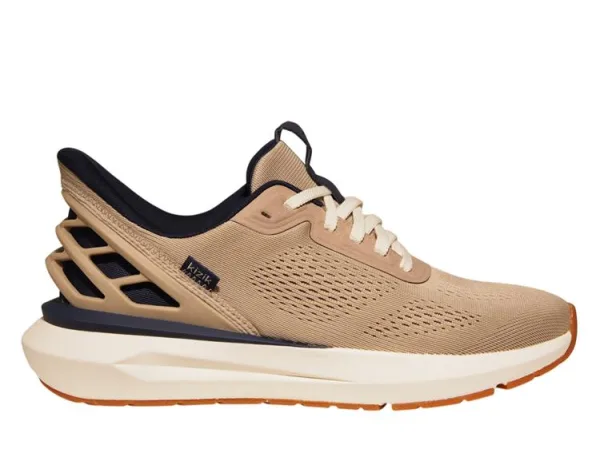 Kizik Athen's heren slip on sneakers in een beige kleur met donkerblauwe accenten. De sneakers zijn voorzien van een innovatief, handsfree instapsysteem, waardoor je ze aantrekt zonder te bukken of je handen te gebruiken. Kizik sneakers zijn licht, comfortabel en ontworpen voor dagelijks gebruik – perfect voor onderweg, werk of vrije tijd.