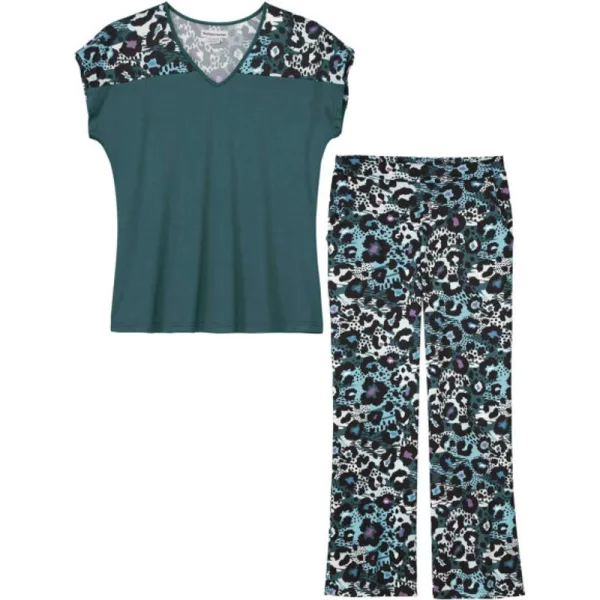 95% Polyester, 5% Elastaan. Stof: Rekken. Ontwerp: Luipaardprint. Zakken: 2 Zijzakken. Waistline: Deel Elastiek. Type mouw: Korte mouwen, Slouch. Hals: V Hals. Stoftechnologie: Lichtgewicht. Dubbel gestikt. Bevestiging: Pull-On. Lengte: 69cm. Inhoud: 1 Broek, 1 Top. Geschikt voor: Comfort. 180gsm.