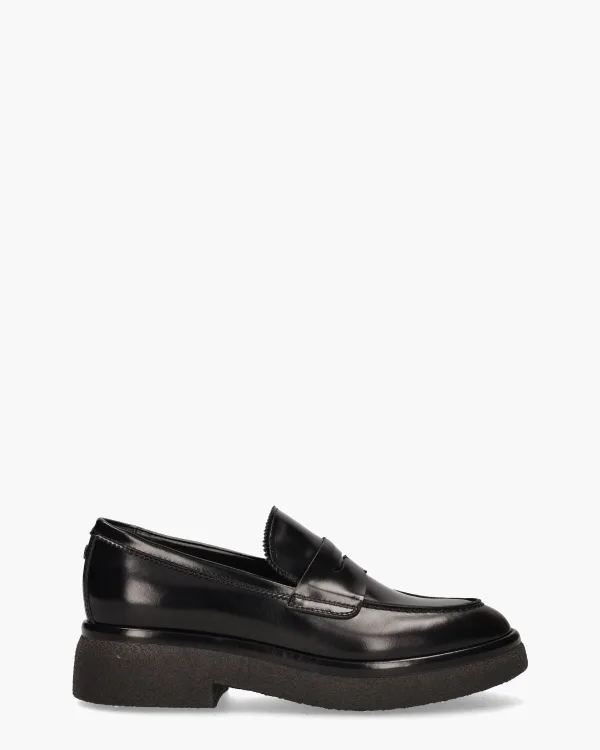 Handgemaakte loafers voor dames Alison D721058 uit de collectie van het Italiaanse merk Attilio Giusti Leombruni - AGL. Deze damesschoen heeft een upper van glimmend zwart leer. De binnenkant is ook volledig in leer met een vast voetbed uitgevoerd. De pennyband op de wreef en de gekartelde afwerking geven de shoes een klassieke uitstraling.