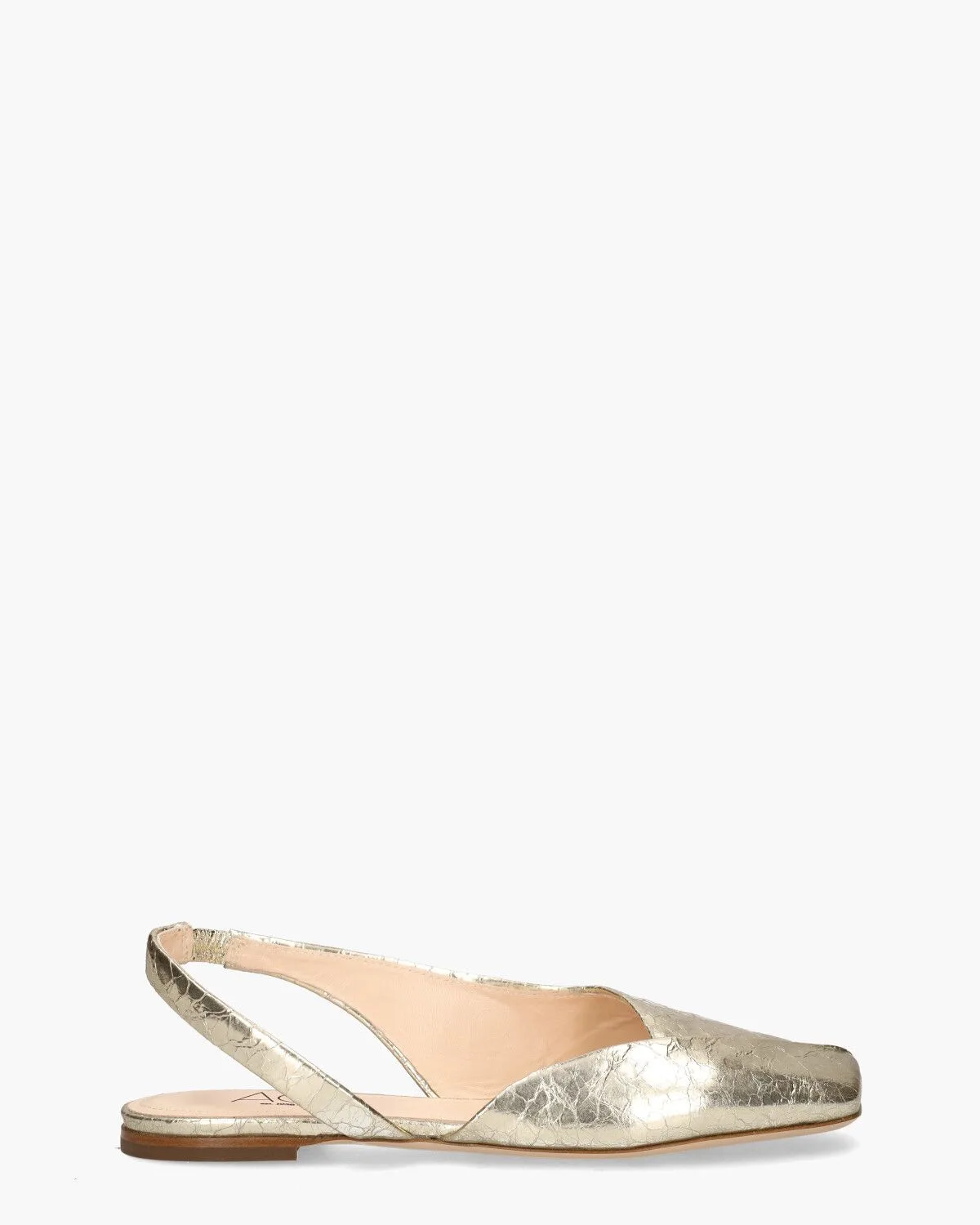 Gouden damesloafers Rina Sling B D550002 van het luxe merk AGL. Deze loafers in slingback-model hebben een shiny gouden kleurtje voorzien van een opvallende craqueléprint. Bijzonder zijn ook de carréneus en het asymmetrische design. Ze zijn gemaakt van zacht leer, zowel aan de buitenkant als aan de binnenkant. Het voetbed is niet