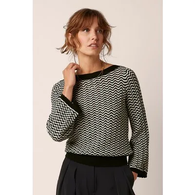 “Classic waves, modern days!” Deze top wil je iedere dag wel dragen! Audrey heeft een elegante boothals, 3/4 trompet mouwen en een speels golfpatroon in zwart en crème. Ze is tevens heerlijk om te dragen dankzij de soepele, stretchy, fijngebreide, organische katoen. * Boothals * 3/4 trompetmouwen * Stretchy ribboord * Lang genoeg om op een normale heupbroek te dragen