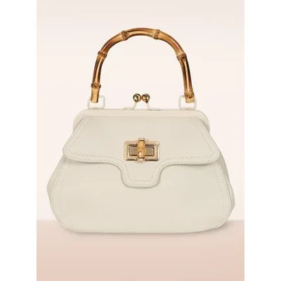 ''We've got your BAG!'' Deze kleine handtas is uitgevoerd in crèmekleurig imitatie leder met een klipsluiting en een opvallend bamboe handvat. Ze wordt bovendien geleverd met een langer, verstelbaar hengsel zodat je haar ook speels om je schouder kunt dragen. * Small sized * Klipsluiting * 2 extra vakjes aan de binnenzijde, waarvan 1 met rits * Afneembaar hengsel * Kan crossbody gedragen worden * Volledig gevoerd * Groot genoeg voor je telefoon, sleutels en je favo lipstick