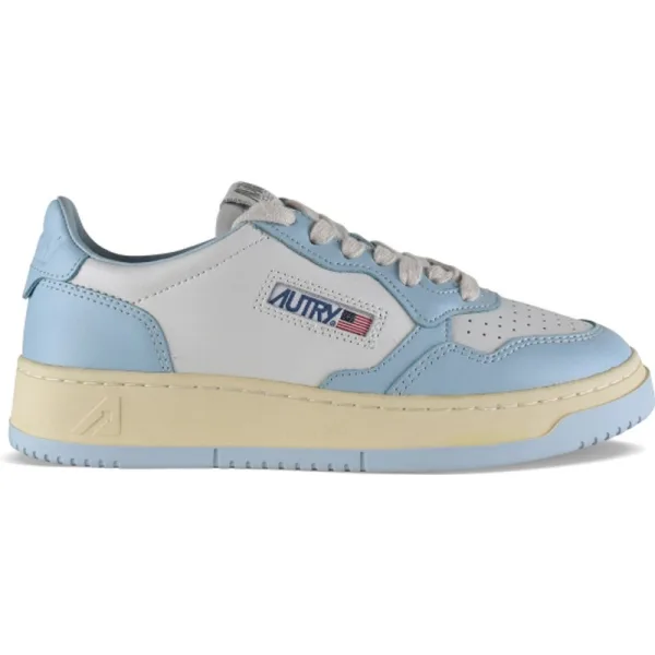 Lage Autry-sneakers van wit en lichtblauw leer.Logopatch aan de buitenkant. Blauwe leren toonbank met logo in reliëf.Tong met logopatch.Rubberen zool met geel effect. Vetersluiting. Geperforeerde ronde neus.100% leer.