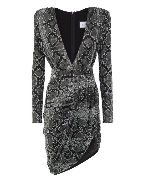 Verhoog en verhelder je figuur met deze originele jersey jurk met lange mouwen. Ontdek alle details. Stretch polyester jersey bedekt met strass-steentjes die een patroon van pythonhuid creëren Pronkende halslijn gedrapeerd in de taille Asymmetrische wikkelrok gedrapeerd aan de linkerkant Gewatteerde schouders Onzichtbare ritssluiting middenachter Binnenvoering
