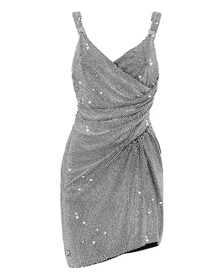 Verfraaid Speciale evenementen vragen om unieke kleding. Wij stellen deze met stras ingelegde jurk van stretchjersey voor. Meer informatie. Stretch-polyesterjersey met glittertjes Gedrapeerde asymmetrische zijkant Decoratieve veiligheidsspelden op bandjes Onzichtbare ritssluiting aan de zijkant