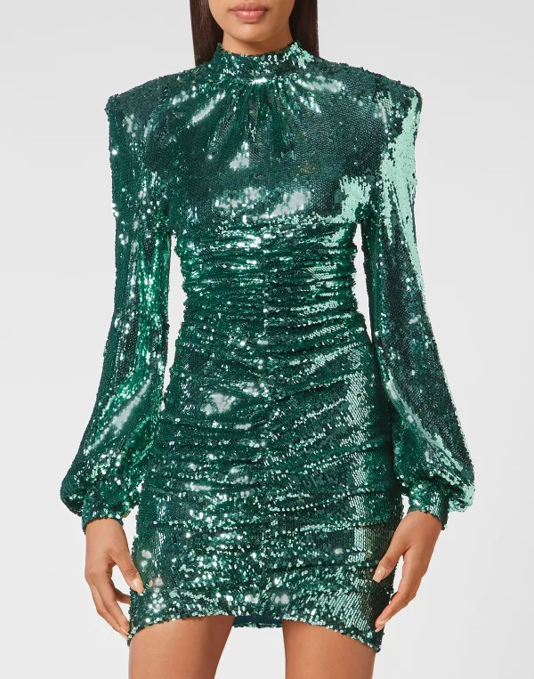 Verfraaid Verhoog je look voor speciale gelegenheden en kies deze jurk met lovertjes en ruches. We suggereren dit model met lange pofmouwen en brede manchetten met twee juweelknopen. Onzichtbare ritssluiting middenachter. De asymmetrische onderkant straalt een vaag retrogevoel uit.