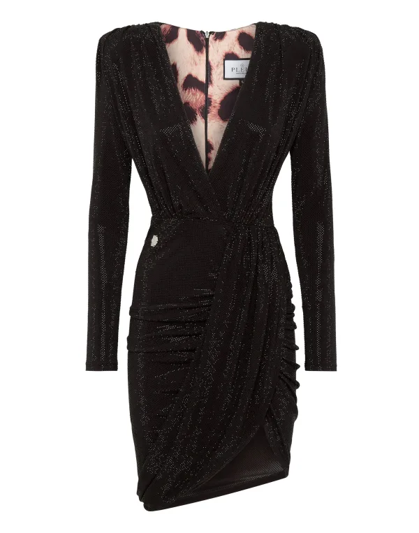 Verhoog en verhelder je figuur met deze originele jersey jurk met lange mouwen. Ontdek alle details. Met bergkristallen bezette stretch-polyesterjersey Diepe halslijn gedrapeerd in taille Asymmetrische wikkelrok gedrapeerd aan de linkerkant Gewatteerde schouders Onzichtbare ritssluiting middenachter Gevlekte voering