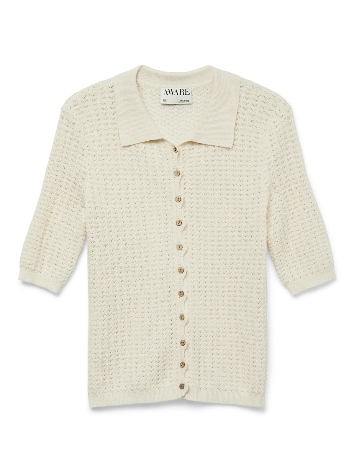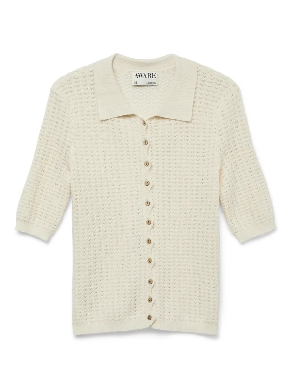 Design: Rechte zoom, Geribd ceintuurtje, Geschulpte zoom; Type sluiting: Knoopsluiting; Materiaal: Knitwear; Halstype: Polokraag; Motief: Effen; Details: Mesh; Extra's: Licht transparant, Fully fashioned, Met textuur; Pasvorm: Normale pasvorm; Armlengte: Halve mouw; Lengte: Normale lengte