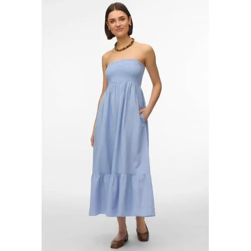 De lichtblauwe strapless midi jurk voor dames van AWARE is een luchtige keuze voor zonnige dagen. De bandeau top met smockwerk sluit soepel aan rond je bovenlichaam, terwijl de rok in een ontspannen A-lijn langs je lichaam valt. De effen lichtblauwe kleur zorgt voor een rustige uitstraling die je makkelijk combineert met sandalen, sneakers of slippers.Lichte stof en doordachte details Gemaakt van 50% viscose, 40% katoen en 10% linnen voor een soepele, lichte en ademende stof. Strapless model met smockwerk aan de bovenkant voor een aangesloten en comfortabele fit. Midi lengte die het midden houdt tussen knielang en enkellang, geschikt voor verschillende gelegenheden. Zijzakken die bijna onzichtbaar zijn weggewerkt en toch ruimte bieden voor kleine essentials. Zonder sluiting, je trekt de jurk eenvoudig over je hoofd aan en uit. Maatadvies: dit artikel valt normaal, kies je gebruikelijke maat. Wasbaar op 30 graden, drogen op lage temperatuur en warm strijkbaar (2 punten).Zomers gemak in één jurkGeschikt voor een lentedag in de stad, een terrasje of een ontspannen etentje in de avond. De smock bovenkant blijft goed zitten, ook als je veel beweegt. Combineer met een denim jack of luchtig vest als het afkoelt en wissel eenvoudig van casual naar iets gekleder met andere schoenen en sieraden.AWARE studio collectieDeze jurk komt uit de studio collectie van AWARE, waarin comfortabele pasvormen en moderne, draagbare stijlen centraal staan. Met aandacht voor fijne stoffen en rustige kleuren maakt AWARE het makkelijk om een garderobe op te bouwen waar je veel naar grijpt, seizoen na seizoen.Een toegankelijke jurk die je snel aantrekt en waar je de hele dag ontspannen in rondloopt.