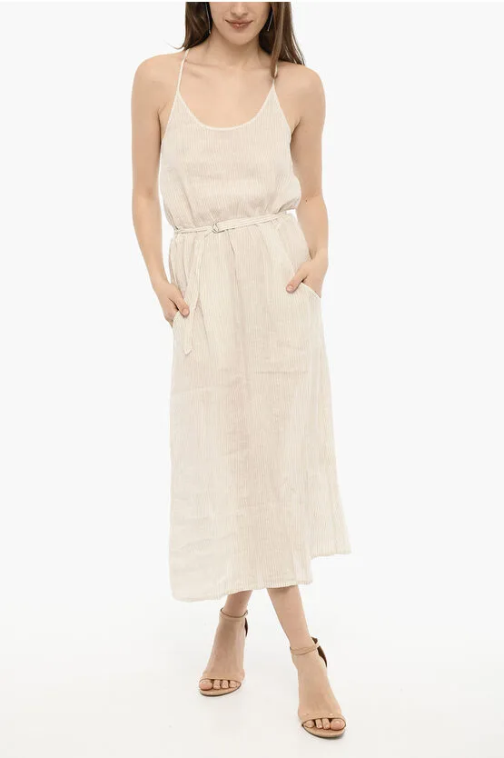 Awning gestreepte linnen maxi-jurk met riem in beige, wit