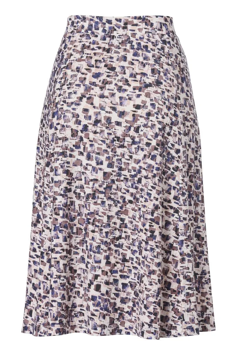 De Ayla print rok is een veelzijdige keuze dankzij zijn ingetogen print. Vervaardigd uit een soepelvallende jersey stof, biedt deze rok een mooie pasvorm. Met een zachte elastische tailleband draagt hij zeer comfortabel. De gevoerde rok valt wijd uit en reikt tot over de knie. Gemaakt van hoogwaardig easy care materiaal, biedt de jersey stof een fijne stretch en is kreukvrij. De subtiele deelnaden zorgen voor een perfecte pasvorm, waarbij de rok mooi aansluit bij de taille en uitloopt vanaf de heup. Combineer deze print rok moeiteloos met de blauwe Harison top en het zandkleurige Aslihan jacket voor een stijlvolle look.