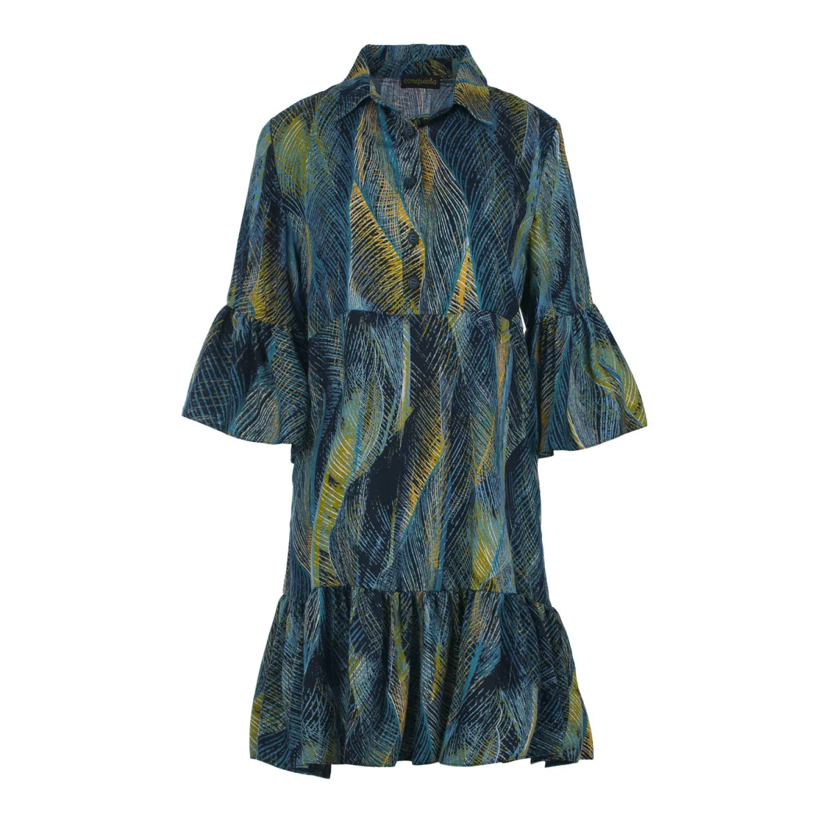 Deze Azure Feather Print Viscose jurk is gemaakt van geweven stretch popeline. De jurk heeft klokmouwen van ¾ lengte. De jurk heeft een kraag en een sluiting in de taille met plastic knopen. Een naad onder de buste zorgt voor een perfecte pasvorm. De jurk heeft een brede zoom met ruches. De jurk heeft een losse pasvorm en valt boven de knie.