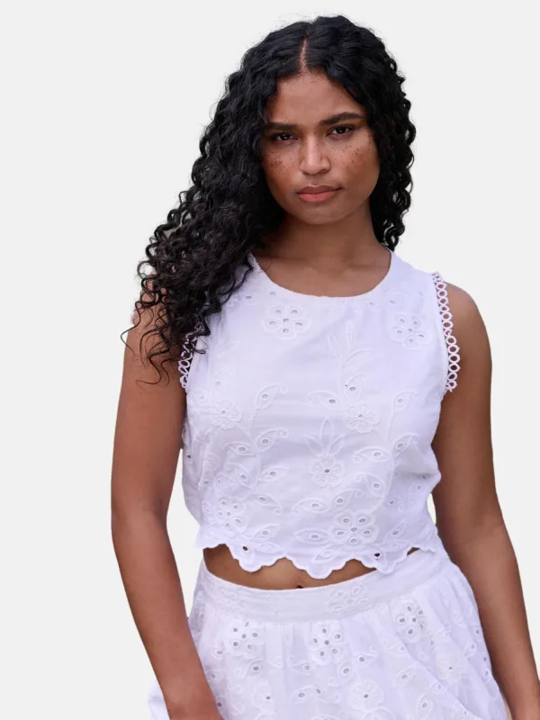 Blouse type: Klassieke blouse; Design: Geschulpte zoom; Type sluiting: Knoopsluiting; Materiaal: Katoen; Motief: Effen; Kraag: Zonder kraag; Details: Cut-outs, Borduursels, Mesh; Extra's: Op staal naden; Pasvorm: Normale pasvorm; Armlengte: Mouwloos; Lengte: Korte pasvorm