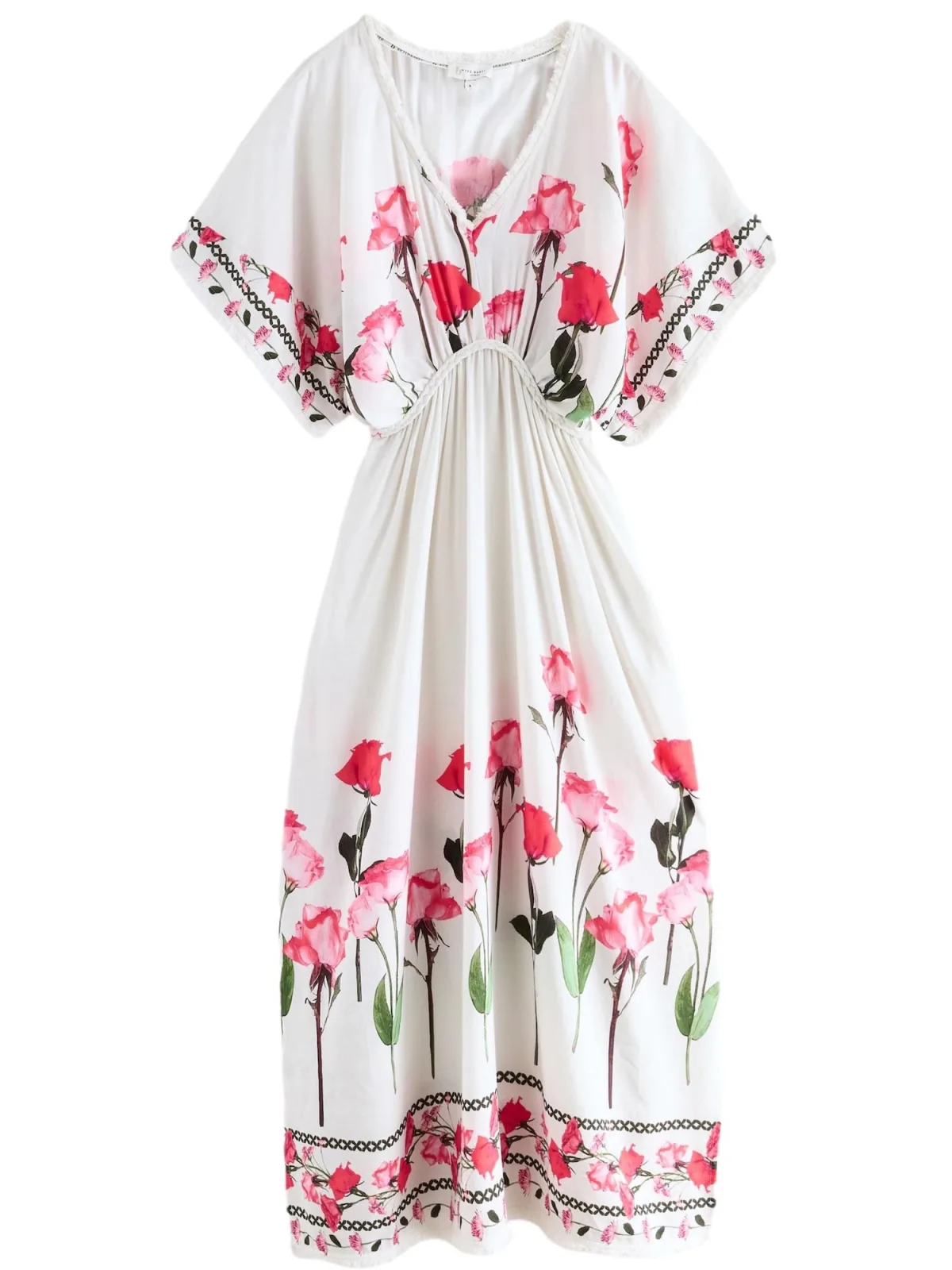 Design: Zijdelingse inkepingen; Materiaal: Viscose; Halstype: V-hals; Motief: Bloemenprint; Details: Franjes, Gedrapeerd; Extra's: All-over patroon; Lengte: Lang/maxi; Snit: Getailleerd; Pasvorm: Normale pasvorm; Armlengte: Driekwart mouw