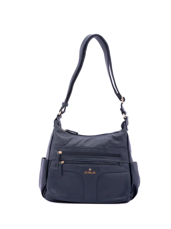 Damesschoudertas met ritssluiting. één met ritssluiting en twee open binnenzakken. twee aan de voorkant met ritssluiting, twee aan de zijkant met magnetische knoop en één aan de achterkant met externe zakken met ritssluiting. ontbrekende schouderband. verstelbaar in eco-lederen handvat. twee binnenvakken. extern materiaal. gevoerd met polyester binnenkant. Afmetingen: 33x25x14 cm. Modeproduct