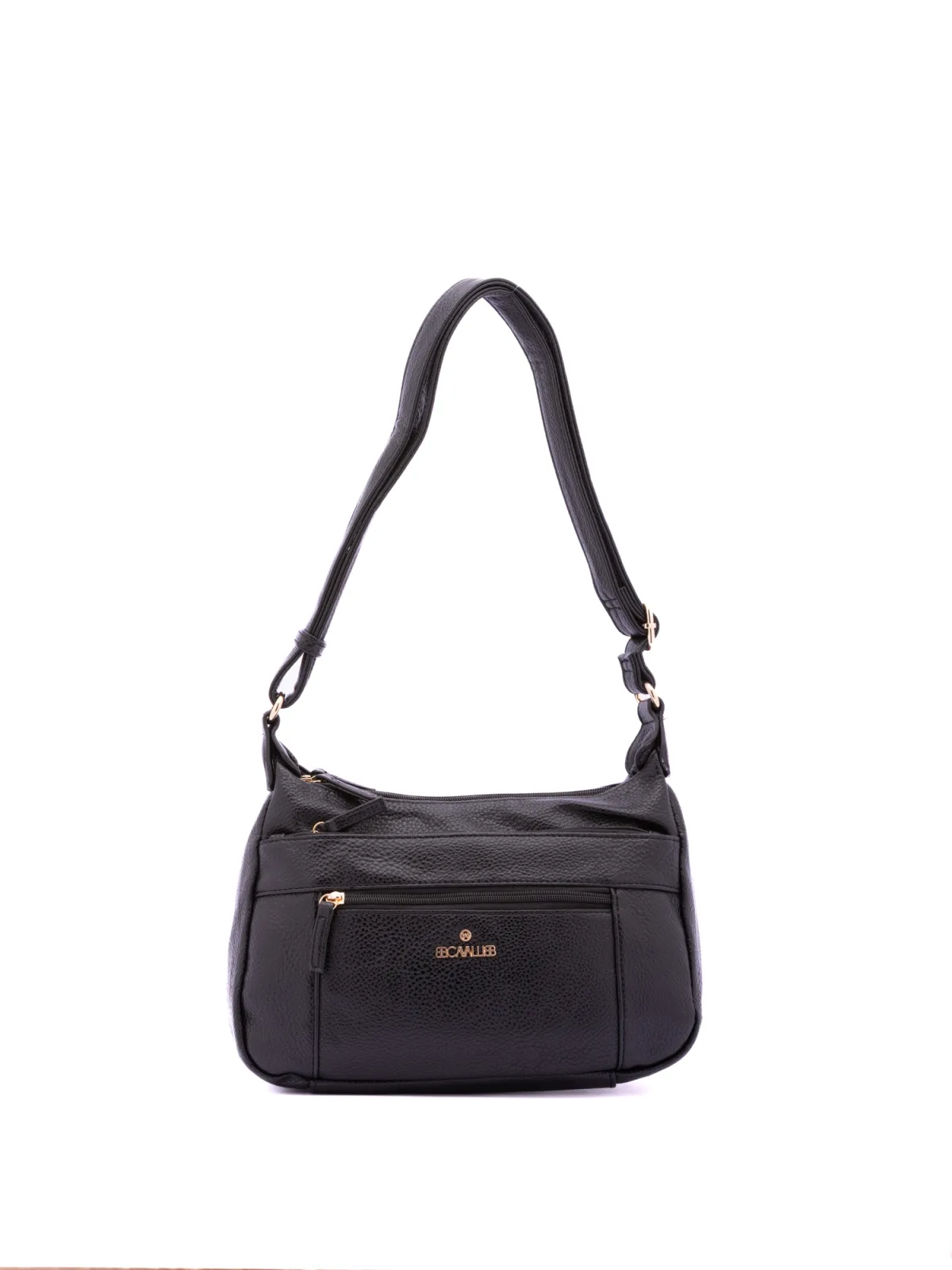 Damesschoudertas met ritssluiting. één met ritssluiting en twee open binnenzakken. twee vooraan met ritssluiting en één achteraan met externe zakken met ritssluiting. ontbrekende schouderband. verstelbaar in eco-lederen handvat. twee binnenvakken. extern materiaal. gevoerd met polyester binnenkant. Afmetingen: 30x20x10 cm. Modeproduct