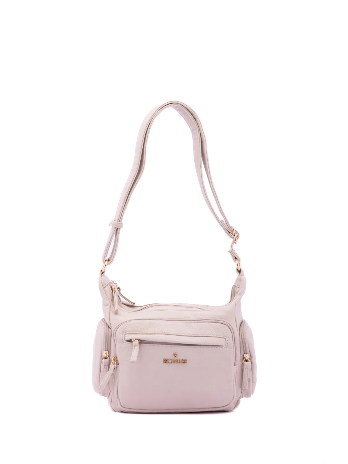 Damesschoudertas met ritssluiting. één met ritssluiting en twee open binnenzakken. twee voorzakken met ritssluiting en twee zijvakken met ritssluiting aan de buitenkant. ontbrekende schouderband. verstelbaar in eco-lederen handvat. twee binnenvakken. extern materiaal. gevoerd met polyester binnenkant. Afmetingen: 26x20x13 cm. Modeproduct