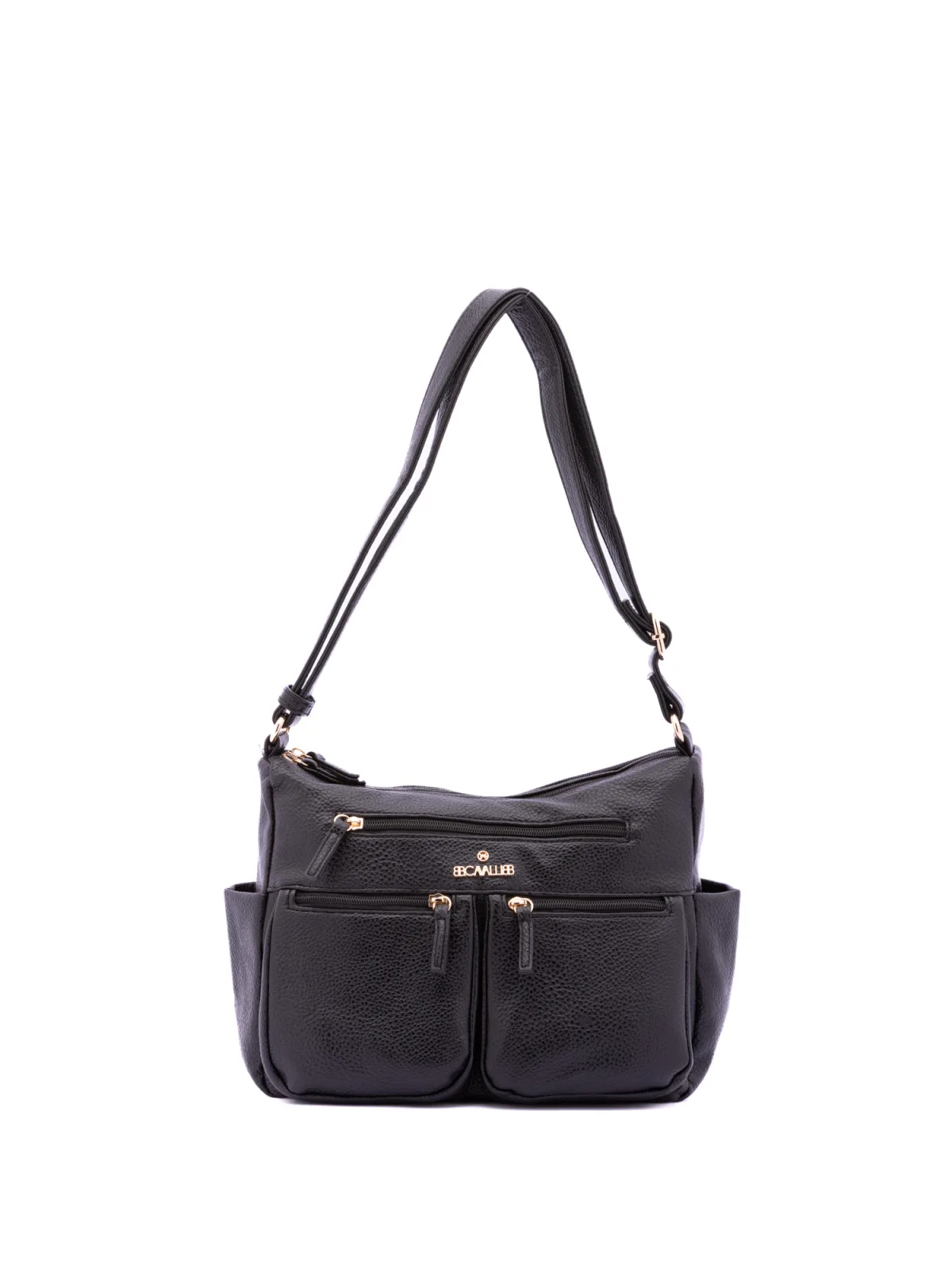 Damesschoudertas met ritssluiting. één met ritssluiting en twee open binnenzakken. drie aan de voorkant met ritssluiting, twee aan de zijkanten open en één aan de achterkant met externe zakken met ritssluiting. ontbrekende schouderband. verstelbaar in eco-lederen handvat. twee binnenvakken. extern materiaal. gevoerd met polyester binnenkant. Afmetingen: 30x21x12 cm. Modeproduct
