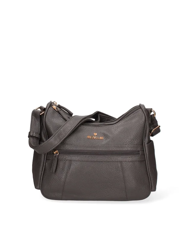 Crossbodytas voor dames met ritssluiting. één met ritssluiting en twee open binnenzakken. één voorkant met ritssluiting, één achterkant met ritssluiting en twee open zijvakken met externe vakken. verstelbaar in eco-lederen schouderband. ontbrekend handvat. twee binnenvakken. extern materiaal. gevoerd met polyester binnenkant. Afmetingen: 28x24x11 cm. Modeproduct