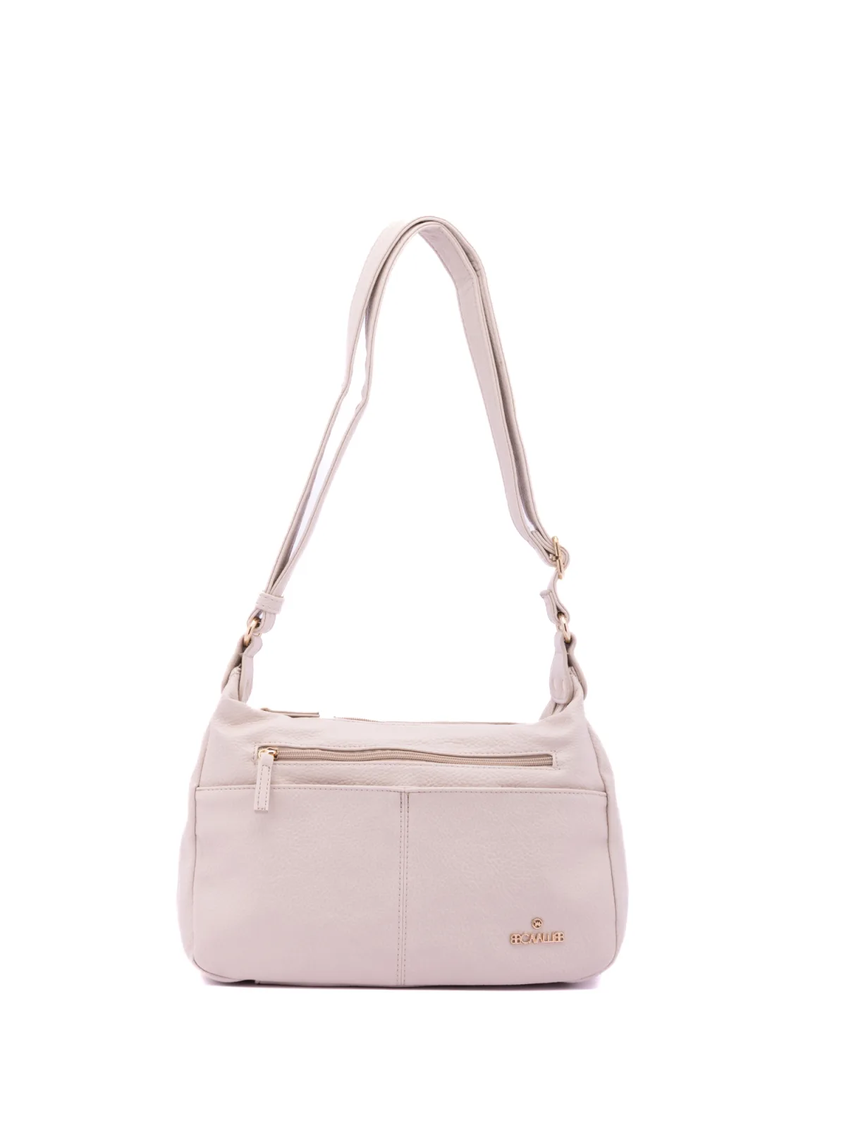 Damesschoudertas met ritssluiting. één met ritssluiting en twee open binnenzakken. één voorkant met ritssluiting, twee fronten met magnetische knoop en één achterkant met externe zakken met rits. ontbrekende schouderband. verstelbaar in eco-lederen handvat. twee binnenvakken. extern materiaal. gevoerd met polyester binnenkant. Afmetingen: 30x20x10 cm. Modeproduct