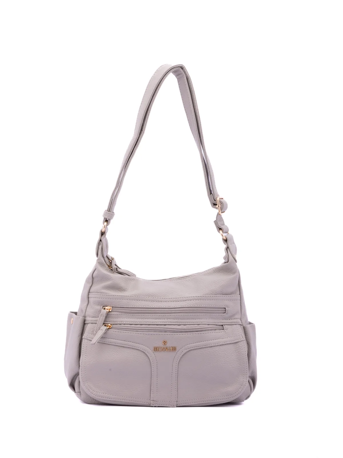 Damesschoudertas met ritssluiting. één met ritssluiting en twee open binnenzakken. twee aan de voorkant met ritssluiting, twee aan de zijkant met magnetische knoop en één aan de achterkant met externe zakken met ritssluiting. ontbrekende schouderband. verstelbaar in eco-lederen handvat. twee binnenvakken. extern materiaal. gevoerd met polyester binnenkant. Afmetingen: 33x25x14 cm. Modeproduct