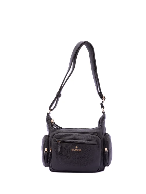 Damesschoudertas met ritssluiting. één met ritssluiting en twee open binnenzakken. twee voorzakken met ritssluiting en twee zijvakken met ritssluiting aan de buitenkant. ontbrekende schouderband. verstelbaar in eco-lederen handvat. twee binnenvakken. extern materiaal. gevoerd met polyester binnenkant. Afmetingen: 26x20x13 cm. Modeproduct