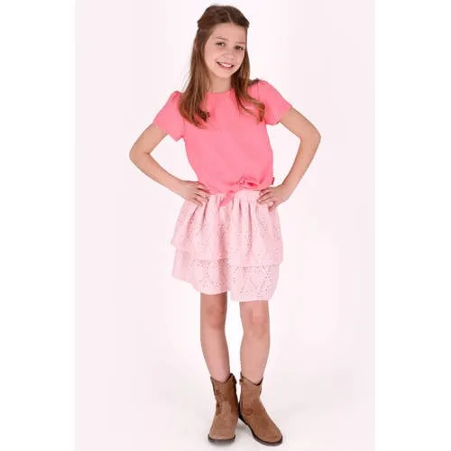 Deze roze B.Nosy meisjes top Bonny is een praktische basic met een speelse twist. De effen kleur maakt het een makkelijk te combineren item, terwijl de pofmouwen en het subtiele knoopdetail zorgen voor een verzorgde uitstraling. Door de korte lengte en ronde hals oogt de top luchtig en fris, geschikt voor warmere dagen of als laagje onder een vest.Details die het verschil maken Korte mouwen met pofeffect voor een meisjesachtige look Effen roze kleur, makkelijk te combineren met rokjes, shorts en jeans Knoopdetail en lichte textuur voor extra uitstraling Korte lengte, passend boven een hoge taille broek of rok Ronde hals die comfortabel aansluit Haaksluiting achter, waardoor de top makkelijk aan en uit gaat Soepel materiaal met stretch voor bewegingsvrijheid Geschikt voor peuters, kleuters, schoolkinderen en tieners Onderhoudsvriendelijk: wasbaar op 30 graden en lauw strijkbaarVoor elke dag en elk momentDe Bonny top komt uit de 'Daily' collectie en sluit aan bij het dagelijks leven van actieve meisjes. Naar school, een playdate of een verjaardag, deze blousetop is veelzijdig in gebruik. Combineer met een jeans voor een casual set of met een rokje voor een meer geklede outfit.Speelse stijl van B.NosyB.Nosy staat voor kinderkleding met vrolijke kleuren, doordachte details en een comfortabele pasvorm. De ontwerpen sluiten aan bij de belevingswereld van kinderen en bieden genoeg bewegingsruimte om te spelen, ontdekken en groeien. Deze top is praktisch in het dagelijks gebruik en makkelijk te combineren met andere kledingstukken uit de garderobe.Een luchtige, speelse top die geschikt is voor dagelijks dragen.