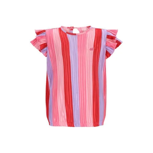 Fris, speels en klaar voor elke dag, dat is deze B.Nosy meisjes top Brook met korte mouwen. De top heeft een ronde hals en rechte mouwen, afgewerkt met fijne plissé en ruches voor een lichte, zwierige uitstraling. De strepen in roze, lila en rood zorgen voor een vrolijk kleurbeeld dat meteen opvalt.Vrolijke details voor elke dag Streepprint in roze, lila en rood voor een opvallende, levendige look Plissé en ruches geven de top een speels en luchtig karakter Ronde hals en korte mouwen, ideaal voor school, feestje of speelafspraak Knoopsluiting, handig bij het aan- en uittrekken Soepel materiaal dat prettig aanvoelt op de huid Geschikt voor peuter, kleuter, schoolkind en tiener, mooi in meerdere leeftijden Onderhoudsvriendelijk: wasbaar op 30 graden en lauw strijkbaarMakkelijk combineren in haar garderobeDeze Brook top past net zo goed op een korte broek als op een denim rok of een comfy legging. De kleuren laten zich eenvoudig combineren met basic items uit haar kast, zodat zij hem vaak kan dragen, zowel doordeweeks als in het weekend.B.Nosy, speelse mode voor kidsB.Nosy staat bekend om kinderkleding met kleur, prints en leuke details. De ontwerpen zijn afgestemd op het actieve leven van kinderen, met aandacht voor draaggemak en een herkenbare, eigen stijl. Zo krijgt zij kleding waar zij zich vrij in kan bewegen en die er tegelijkertijd eigentijds uitziet.Een speelse top die haar dagelijkse outfits net dat beetje extra geeft.