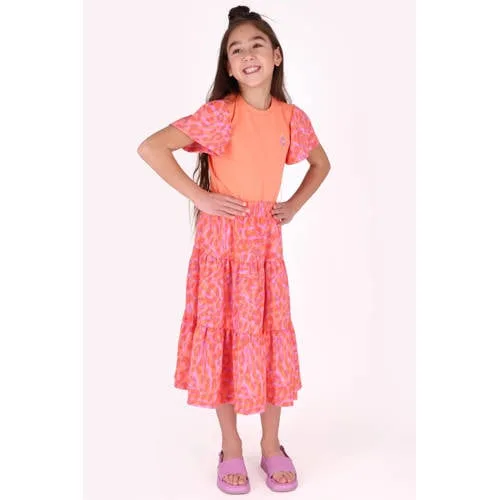 Deze B.Nosy meisjes rok Riri is gemaakt voor dagen vol beweging, plezier en een beetje lef. De rok valt als een speelse maxirok met stroken en heeft een opvallende panterprint in roze en oranje. De soepele, elastische stof beweegt gemakkelijk mee, zodat rennen, spelen en dansen geen enkel probleem is. Een elastische tailleband zorgt voor een fijne pasvorm, zonder knopen of ritsen.Speelse details voor elke dag Maxirok met stroken voor een zwierig effect bij elke stap Panterprint in roze en oranje voor een opvallende, speelse look Elastische tailleband, makkelijk zelf aan en uit te trekken Met stretch door het elastaan voor extra bewegingsvrijheid Geen zakken, waardoor de rok mooi soepel langs het lichaam valt Geschikt voor peuter, kleuter, schoolkind en tiener Onderdeel van een co-ord set, leuk te combineren met bijpassende items uit de collectie Wasbaar op 30 graden en lauw strijkbaar, niet drogen in de droogtrommelVoor school, feest en alles daartussenDe Riri rok past net zo goed op een gewone schooldag als bij een feestje. Met een simpel T-shirt en sneakers ontstaat een relaxte dagoutfit. Combineer met een top in een van de kleuren uit de print voor een rustige, maar toch opvallende set.B.Nosy: speelse mode voor nieuwsgierige kidsB.Nosy staat bekend om vrolijke prints, heldere kleuren en comfortabele pasvormen. Elk ontwerp is gemaakt met oog voor kinderen die graag bewegen en zichzelf willen laten zien. Met deze rok kies je voor kinderkleding die tegen een stootje kan en waarin je kind zich vrij kan voelen.Een kleurrijke rok die elke dag net even leuker maakt.