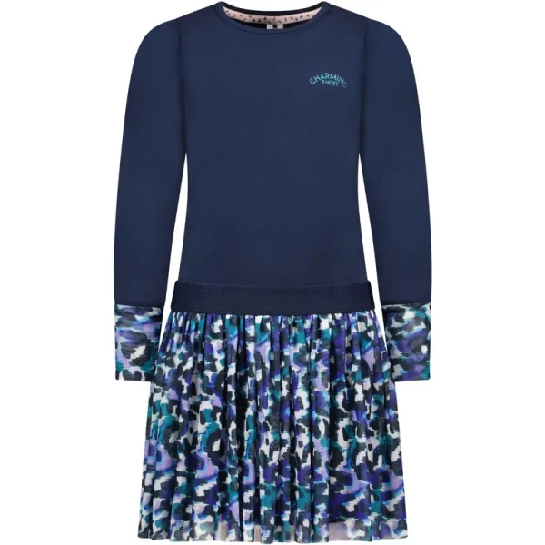 meisjes jurk Charming met aop op de rok en uiteinde mouwen Navy