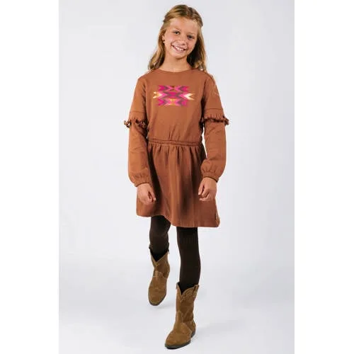 Deze Dynia jurk van B.Nosy heeft rechte mouwen en een ronde hals. De jurk is gemaakt van 100% katoen en heeft een elastische tailleband, franjes en een printopdruk. Het model valt als midi.