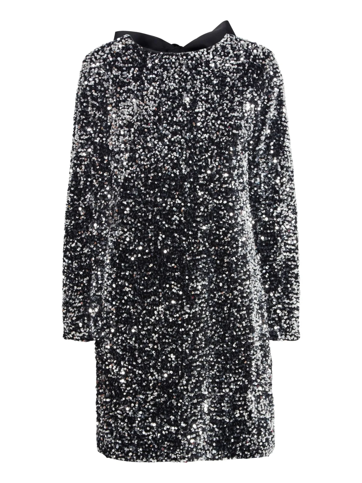Design: Gevoerde zoom/rand; Type sluiting: Snoersluiting; Halstype: Ronde hals; Motief: Effen; Details: Pailletten; Extra’s: Op staal naden; Lengte: Kort/mini; Snit: Recht; Pasvorm: Normale pasvorm; Armlengte: Lange mouw