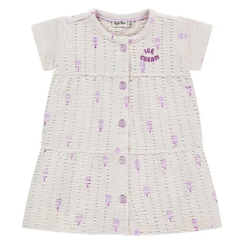 Voor de allereerste zomerse dagen is deze Babyface meisjesjurk van katoen een praktische basic voor elke baby garderobe. De jurk heeft een rechtvallend model dat zacht om het lijfje valt en volop bewegingsruimte geeft. De ecru kleur met lila all over print zorgt voor een frisse, speelse look die goed past bij de dagelijkse momenten met je kleintje.Zachte dagelijkse favoriet Gemaakt van 95% katoen/5% elastaan, voelt zacht aan op de tere babyhuid en beweegt gemakkelijk mee Korte jurk met rechtvallende pasvorm, comfortabel om in te liggen, kruipen en spelen Korte rechte mouwen, ideaal voor warme dagen of onder een vestje op koelere momenten All over print in ecru/lila voor een speels, kindvriendelijk uiterlijk Knoopsluiting maakt het aan- en uittrekken eenvoudig, ook bij pasgeboren baby’s Open detail als subtiel, sierlijk accent in het ontwerp Geen zakken, zodat de jurk licht en soepel blijftPraktisch in de dagelijkse routineDeze jurk uit de 'Daily' collectie is gemaakt voor elke dag. De soepele stof is prettig bij het verschonen en omkleden, terwijl de knoopsluiting het aankleden makkelijker maakt. Combineer met een legging of maillot op frissere dagen of draag de jurk los bij hogere temperaturen.Babyface voor de allerkleinstenBabyface richt zich speciaal op baby’s en newborns. De collecties zijn afgestemd op de behoeften van kleintjes, met zachte materialen en doordachte details voor dagelijks gebruik.Een comfortabele keuze voor elke dag met je baby.